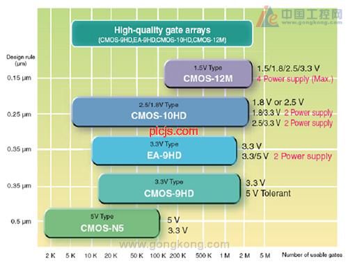 瑞萨电子的门阵列产品目前已经涵盖到5M逻辑门,可以从非常广的范围内对客户的设计进行支持。目前已经在工业控制和通讯等领域得到了广泛应用。瑞萨电子(原NEC电子)的门阵列和嵌入式阵列提供丰富的宏,包括用于高速接口如SSTL2、SSTL3、和 LVDS的I/O 宏,以及用于串行控制器和外围接口的功能巨宏元。为了更高的集成度,嵌入式阵列中也有标准单元IC的存储器。