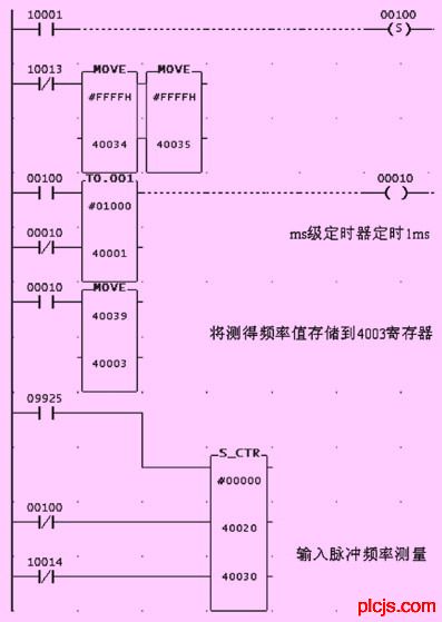 为了使用普通plc模块实现高速脉冲的计数,采用了专用的软高速计数指令,既保证了测量的精度,又简化了程序。为了提高计时精度采用了精度为1ms的定时器,并用同一信号控制定时器和软高速计数器的起停。WWW_P※LCJS_CO※M-PLC-技-.术_网